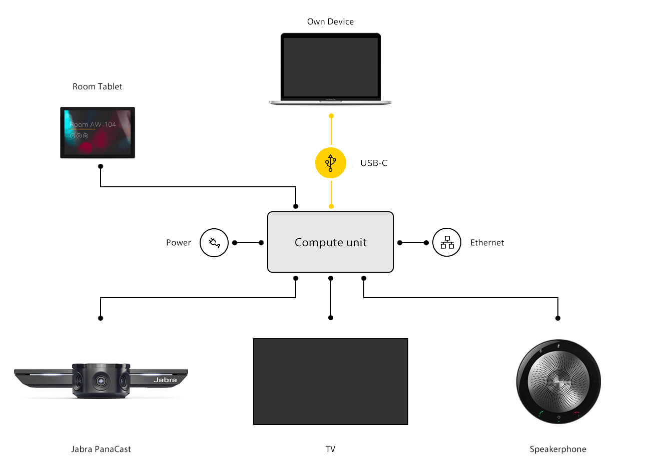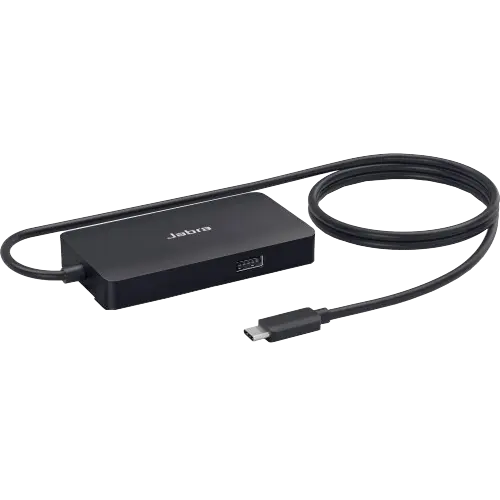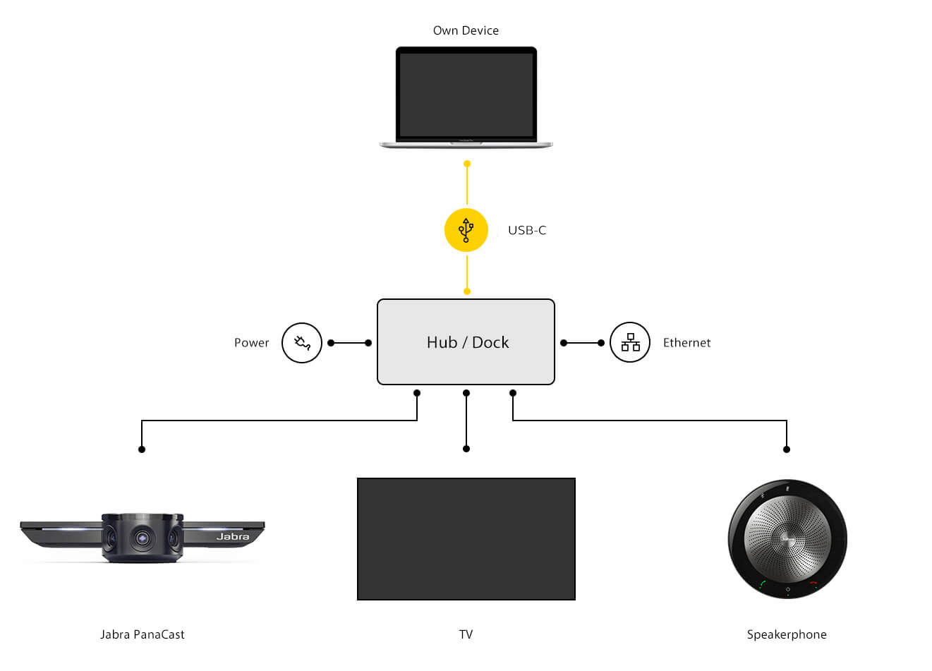 Jabra PanaCast is plug-and-play but you can also combine with a hub or dock that also connects speaker, TV, power and internet, for a simple one-cable user interface